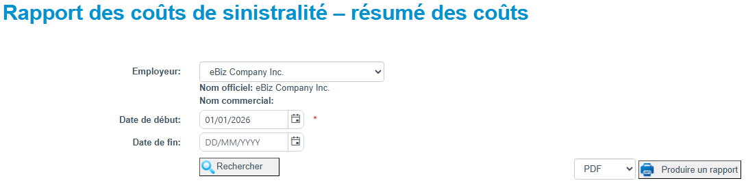 Si vous avez besoin d’un rapport des coûts de sinistralité – résumé des coûts avec l’en-tête de la WSCC, vous pouvez en générer un en format PDF ou Excel. Sélectionnez le type de rapport dans la liste déroulante, puis cliquez sur Produire un rapport.